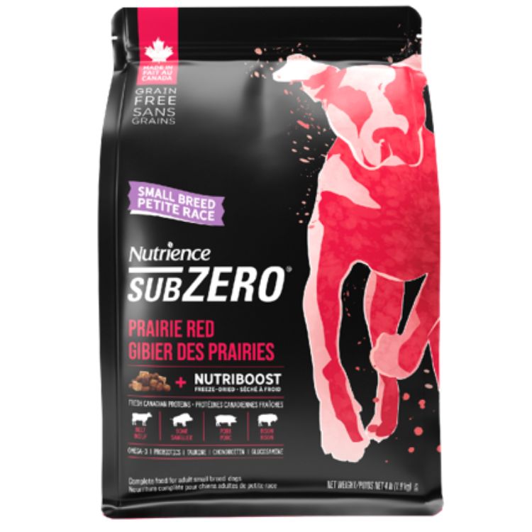 נוטריאנס סאב זירו לכלבים מגזע קטן בכל הגילאים מזון יבש נטול דגנים מבשר בקר, בשר ביזון ודגי ים מסדרת Sub Zero של Nutrience.