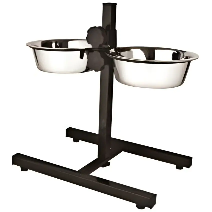 מתקן האכלה לכלב עם מעמד מתכוונן ורגלי H, הכולל זוג קערות נירוסטה למזון ולמים – למניעת התהפכות ולהתאמה נוחה של גובה ההאכלה.