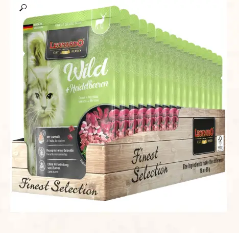 מחית סופר-פרימיום לחתולים מבית Leonardo – מזון מלא המבוסס על בשר צייד ועוף, בתוספת אוכמניות, שמן סלמון וציר עשיר.