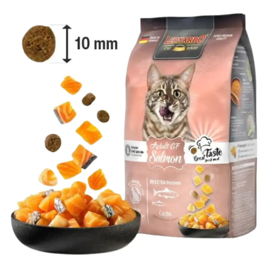 לאונרדו סלמון ללא דגנים הוא מזון יבש סופר פרימיום לחתולים בוגרים מגיל שנה, אשר פותח במיוחד עבור חתולים בעלי רגישויות תזונתיות או אלרגיות למזון
