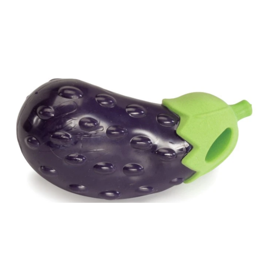 משחק בעיצוב ייחודי של חציל, עשוי מחומר גומי רך ונעים, כולל מנגנון צפצוף שמפעיל את יצר המשחק של הכלב.